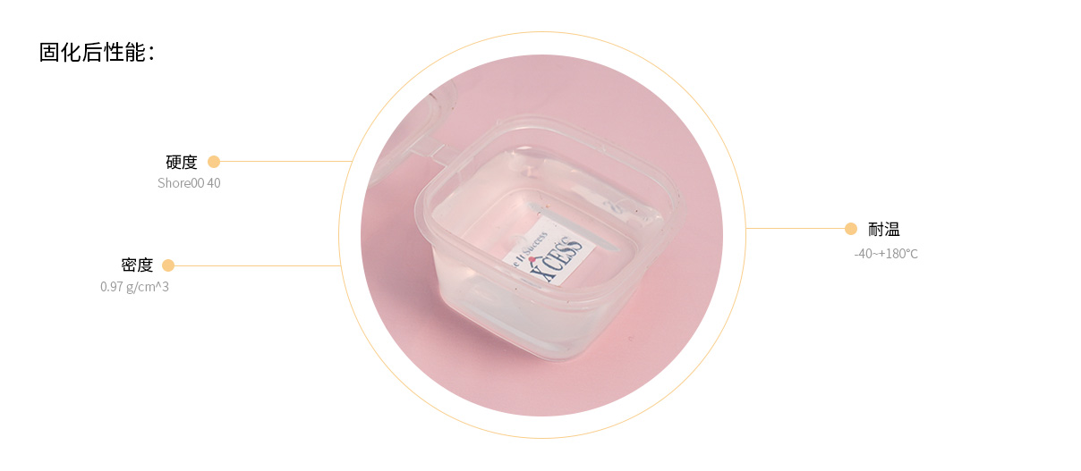 雙組份,10:1比例混合; 低粘度;室溫下快速固化(UV激活后); 低硬度(shore 00); 可通過熒光燈實現(xiàn)工藝控制(含UV示蹤劑)。