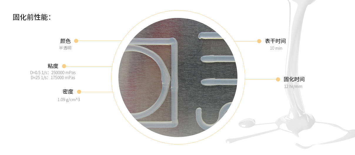 單組份室溫固化; 無塌陷自流平; 粘結強度優(yōu)異,特別是對硅橡膠具有優(yōu)異的粘結強度; 醫(yī)療級。